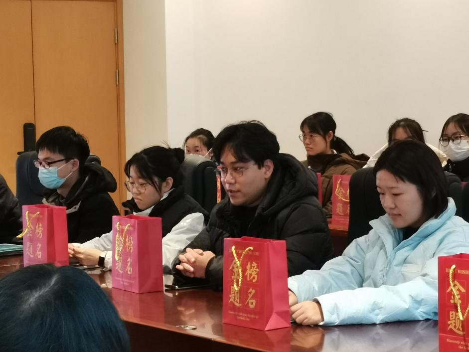 活动伊始,学院为每位考研学生发放精心准备的考研加油包,祝愿他们考研成功上岸,金榜题名。随后,两位学生代表吴宇哲、杨起越发言,分别就自己备考规划以及当前面临的困难与在场师生进行了交流。吴宇哲表示在考研巨大压力之下,复习效率和学习时间都受到较大影响,但依然会坚定自己考研的初心,努力克服困难,抓住冲刺阶段的宝贵时间,考出优异成绩。杨起越表达了对学院的感谢,表示真切感受到寒冬中由学校传递来的“温暖”。