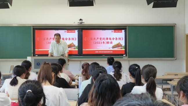 5月20日,院党委书记郑宁面向教工第二党支部、教工第四党支部、硕士研究生第一党支部讲授专题党课,他以《为推进党的伟大事业提供坚强纪律保证》为题,从加强纪律建设的重要性、《中国共产党纪律处分条例》(以下简称《条例》)的修订情况、主要内容及特点、贯彻落实党纪学习教育基本要求等方面展开。郑宁强调,广大师生党员要做“学纪、知纪、明纪、守纪”的践行者,牢记全面从严治党永远在路上,党的自我革命永远在路上。