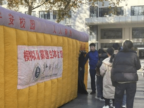 此外,活动现场还设置了“虚拟灭火”和“模拟烟雾逃生体验馆”等互动设备。大家面对模拟火源,严格按照操作规范,成功将“大火”扑灭。师生们在逼真的虚拟场景中巩固灭火技能,并在充满无害模拟烟雾的黑暗逃生屋内,切身感受火场中的紧张氛围,学习低姿匍匐、湿毛巾捂口鼻等关键逃生技巧。