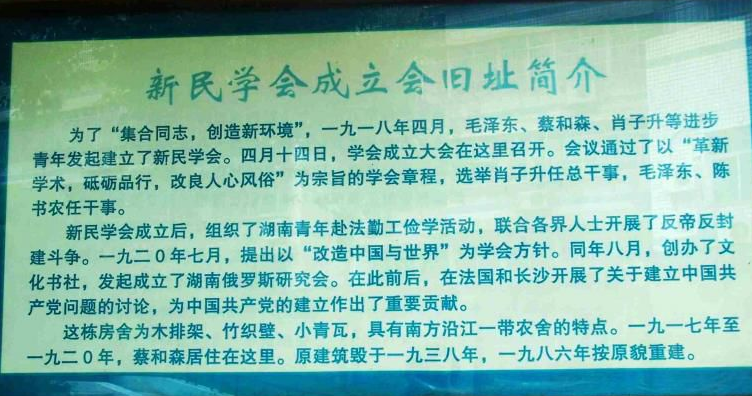 新民学会成立会旧址暨蔡和森故居位于长沙市荣湾镇周家台子。毛泽东在第一师范求学期间,与同学肖子升、张昆弟等经常到蔡和森家来聚会,并经常进行三浴(太阳浴、雨浴、风浴),即有意对着风吹雨淋,对着太阳晒,以此来锻炼自己的体魄,陶冶自己的情操。为改造中国与世界,1918年4月14日,毛泽东与蔡和森、何叔衡等在此开会,成立了著名的新民学会,当时有会员20余人,毛泽东当选为干事,是“五四时期”以学生为主体的众多进步团体中成立最早的,并于1920年发展到70多人,成立湖南共产主义小组,为中国革命史谱写了光辉的一页,为中国共产党的创立作了准备,并为宣传马克思主义,做出了重要贡献。