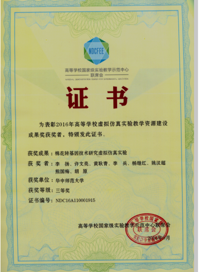 闭幕式上,大会进行了颁奖仪式。由我院李扬、许文亮、黄耿青、李兵、杨继红、姚汉超、熊国梅、胡原共同完成的“棉花转基因技术研究虚拟仿真实验”项目获评高等学校虚拟仿真实验教学资源建设成果奖三等奖。据悉,本次大会生物组只有5项获评该奖项。