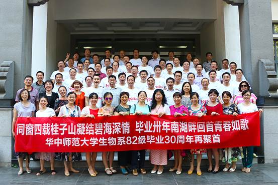 华大生科讯(通讯员 王珏 李雨欣 朱锦精)7月30日下午,华中师范大学生命科学学院82级75名校友齐聚华师逸夫国际会议中心,在毕业三十年之际欢聚桂子山,共话校园情谊与师生变化。此次聚会特别成立“生科82基金”,以支持关爱生科院学生的培养教育。校党委副书记覃红、国内合作与校友办公室主任王志彬、生科院党委书记邱玉华、院长邱保胜、校思想政治教育研究所所长万美容出席了活动。