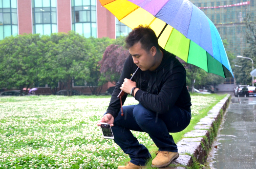 十一点五十二分,路经博雅广场,草坪上的花在雨中盛开得格外娇艳欲滴。惊叹之余,唐老师不由自主地俯身进行拍摄,只为留下这一刻美丽的瞬间。他会心一笑:“哈哈,下节课的题材又有啦。”欣赏着生活之美,他也不忘了教学工作。