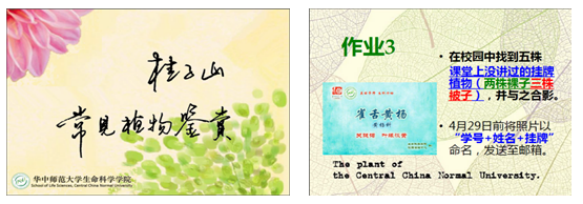 该课程分为两种授课形式——集中授课和户外观察。“工欲善其事必先利其器”,在理论课上唐佳琦老师会先大家介绍桂子山上常见裸子、被子植物的分类地位、形态特征、应用价值等。他的课堂常常会传来阵阵赞叹声,并非因为内容深奥,而是因为那些植物都常常为同学们平日所见却道不出名,譬如校园中随处可见的校草“吉祥草”,让人路过不禁掩鼻的“石楠”,抑或是漫天飘絮的“英桐”。除此之外,飘逸俊秀的PPT手写,美味可口的教学工具,更是为整个课堂增加了不少亮点。