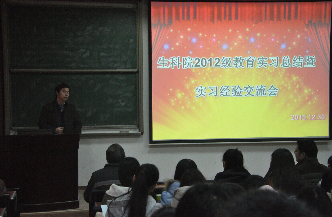 总结交流会上,刘家武老师首先对2012级的教育实习工作进行总结,宣读了优秀实习生、优秀实习小组、优秀指导教师的人员名单,并向他们表示祝贺。