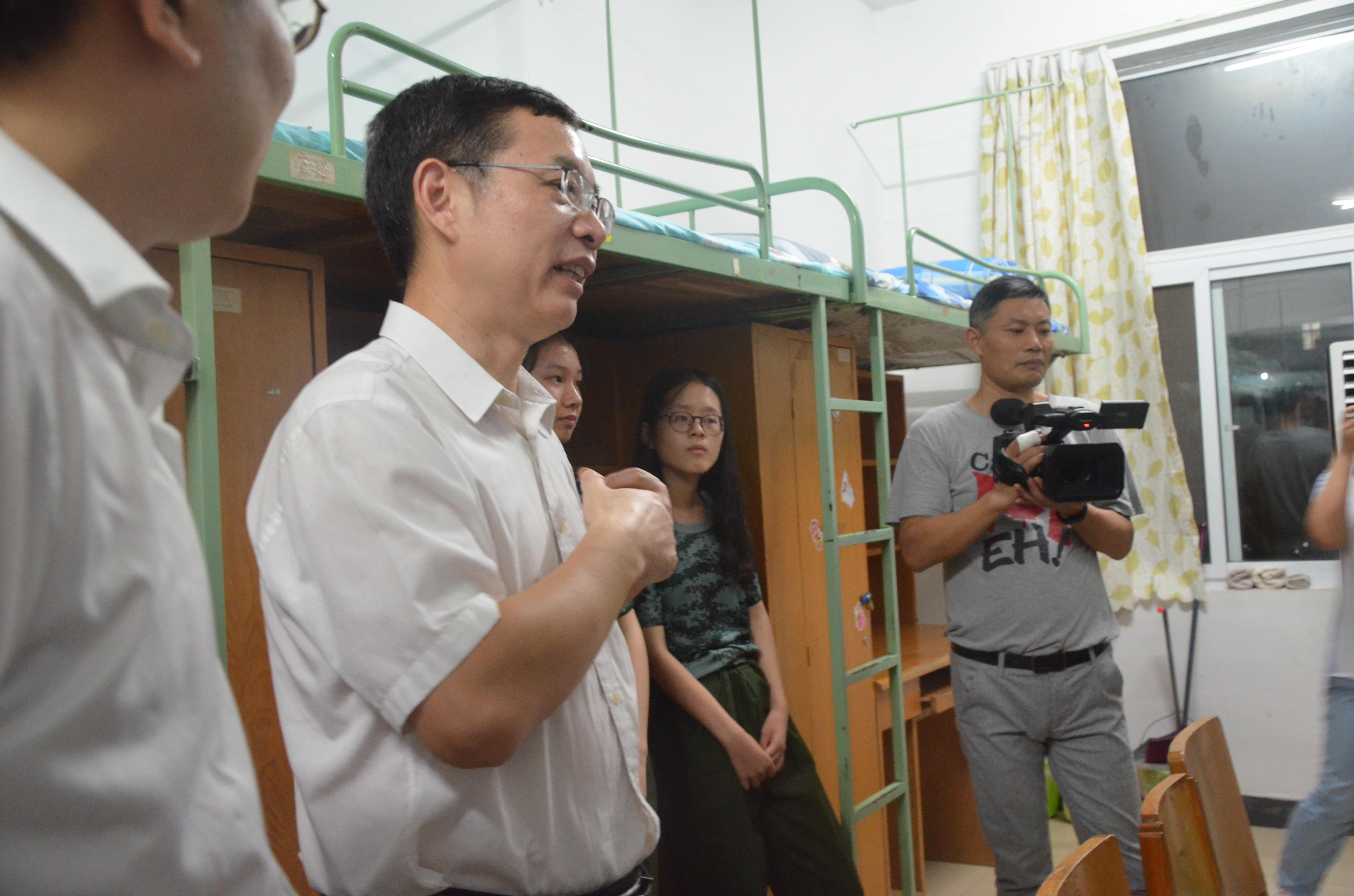 在双胞胎姐妹宿舍,校长首先给两姐妹带来诚挚的问候,宿舍正在教授整理内务的教官和学生们对校长一行人的到来表示热烈的欢迎。随后,校长问俩人为什么选择华师,两姐妹告诉大家是综合考虑了城市和自身的兴趣爱好两方面的因素,希望以后能够当一名老师,传道授业解惑、建设家乡。