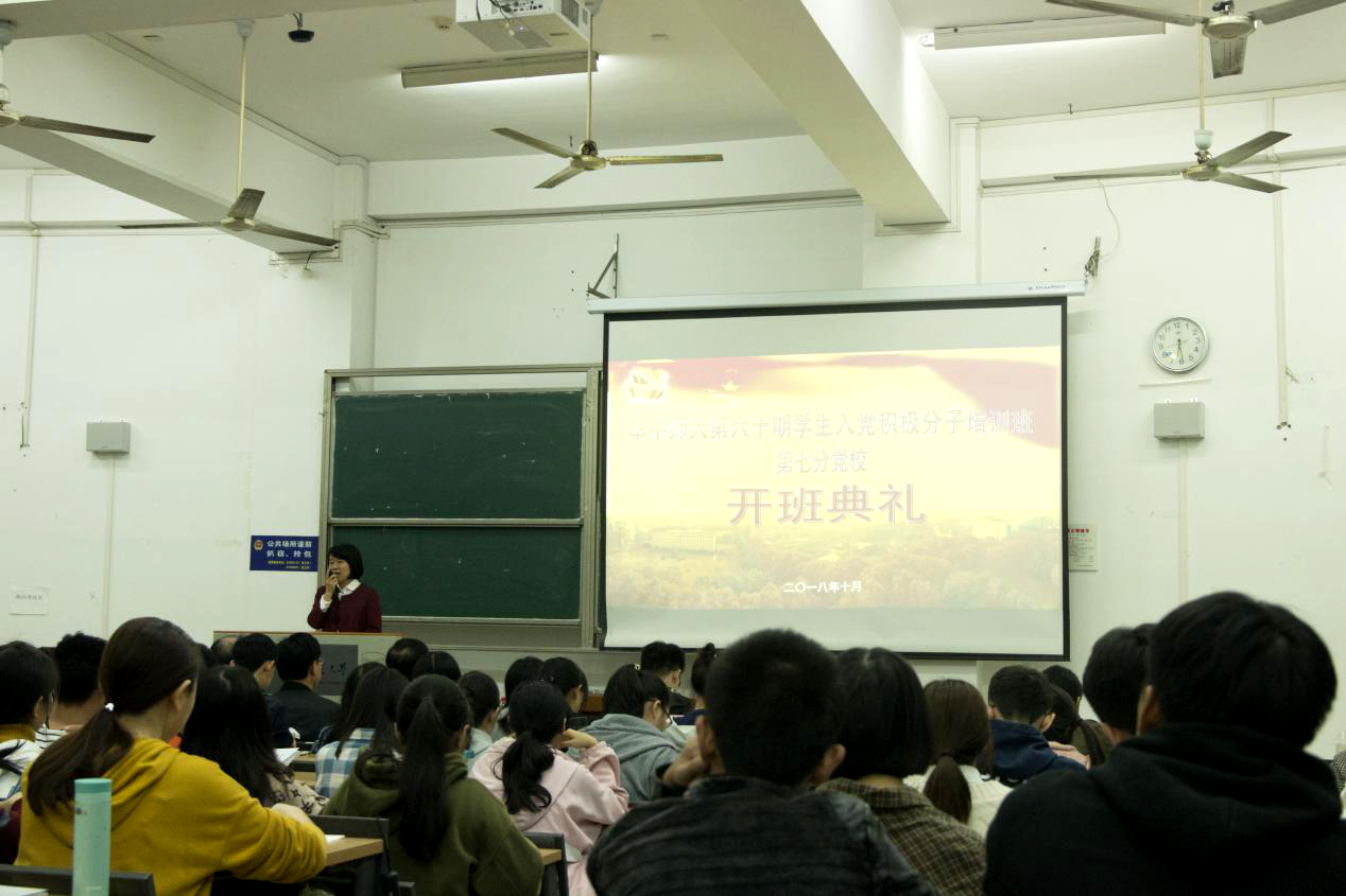华大生科讯(通讯员 黄晨)10月19日晚,我校第60期入党积极分子培训班第七分党校开班典礼在9号楼9401教室举行。开班典礼由公共管理学院党委副书记曾艳主持,生命科学学院党委书记邱玉华,城市与环境科学学院党委书记梁志群、副书记黎俊玲以及班主任魏寅和各学院带队老师出席了本次开班典礼。我院党委书记邱玉华在开班典礼上发表讲话。