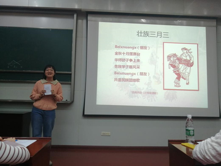 期间,壮族同学李贝贝现场演唱了一段动听的壮族歌曲,并向观众介绍了壮族最盛大的节日“壮族三月三”,“壮族三月三”是山歌的集会,在这一天大家穿着民族服饰聚集在一起,载歌载舞,以歌会友,以歌传情。韩沛珏同学以自身经历为大家诉说了作为蒙古族的她与大家没有什么不同,她极富感染力的演讲博得满堂喝彩,给观众留下了深刻印象。来自维吾尔族的古再丽努尔·米吉提同学为大家介绍了民族村里的“最美乡村教师”周丽娜老师。周老师因为爱情与丈夫定居阿图什,作为村里唯一的汉族人,她教学生们说汉语、学汉字,用自己的实际行动来促进中华民族大团结。选手们都各具特色,有的慷慨激昂,有的成熟稳重,有的幽默风趣,充分向观众展现了个人魅力和民族风采。
