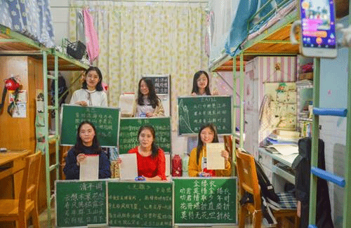 学习活动结束后,夏玉琴开始走访每个宿舍。寝室里,准备被点名的全体同学向镜头展示介绍了她们精心准备的钢笔字和粉笔字。主播的镜头还会将每个寝室的整体环境呈现给观众。17级辅导员王棣和年级团总支学生会成员担任评委,评出钢笔字和粉笔字单项奖,直播间的其他观众则在年级群投票里评选出寝室卫生集体奖,各项目的优胜者将获得一台除湿机。有的寝室为了拿下集体奖项大展才艺,并不宽敞的寝室即刻变身舞台。整个活动持续了近一小时,不仅生科院17级学生活跃在直播空间,其他学院的同学也进入直播间一睹风采。线上刷礼物应接不暇,热闹非凡。到点名结束时,直播间的观众952人,点赞量9300余次。