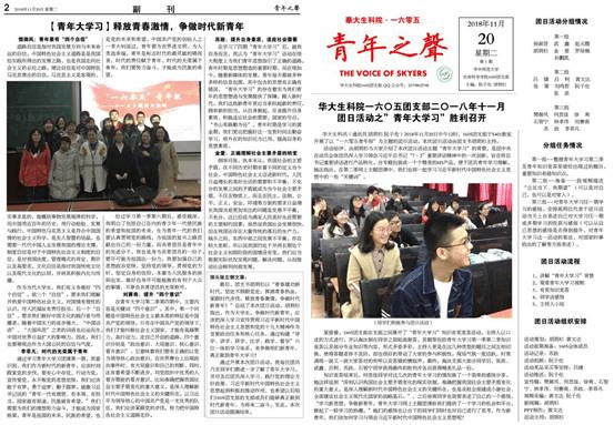 据悉,本次“青年之声”青年报为1605团支部首次制作,为年级“青年之声”青年电子报的延续开了个好头。据了解,青年报的制作是1605团支部从17级辅导员王棣老师处获得的灵感,相较于以往常规的团日活动新闻稿,青年报更一目了然,同时也能很好的带动同学们关注时事,积极思考。最后,希望“青年之声”越办越好!