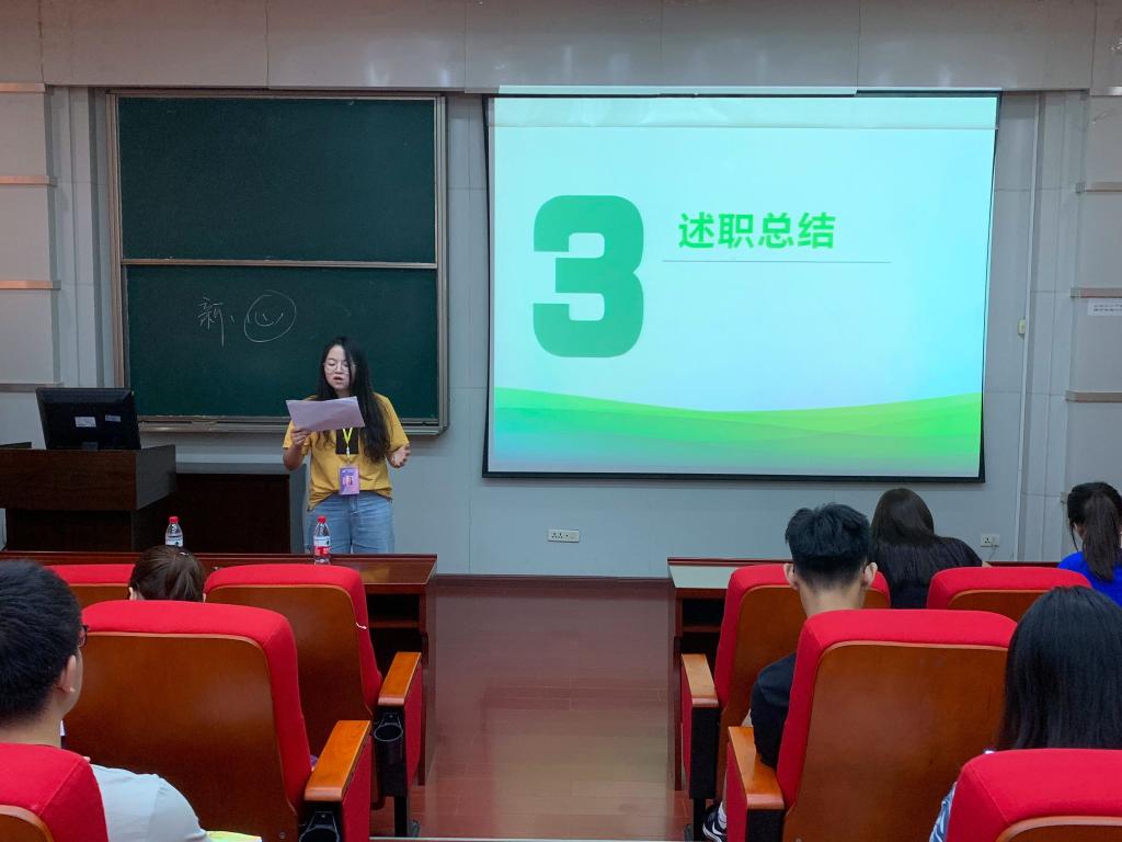 紧接着,各部门按照顺序进行述职。首先组织部部长庞康明就部门建设、工作总结和未来展望三方面展开述职。过去的一年里组织部采取“支部互评团日活动”、“团支书沙龙”、“标签团支部建设”等措施创新组织工作,并提出未来工作的目标。随后,宣传部部长吴微微以“思想引领”、“生科之窗”两个关键词为主线,总结了宣传部在本学年从新闻稿规范、宣传工作联席会议管理制度、新闻宣传培训营和舆情收集等几个方面展开的工作,并总结了工作的优缺点,希望能从初稿流程规范、加强宣传效果和建立舆情收集鼓励机制等方面改进宣传工作。