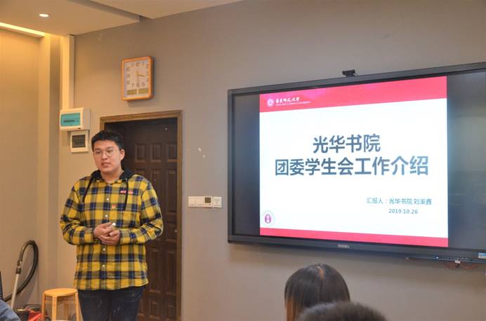 首先,唐佳琦老师作亲切致辞,回顾了我院的发展历史,介绍了生科院的今年来高速发展的概况,并对以“格致诚正,求实创新”为院训的光华书院的到来表示热烈欢迎。紧接着,我院团委副书记庞康明对我院团委学生工作进行了介绍,然后光华书院学生会主席刘秉鑫对光华书院及部门作了简要介绍,并介绍了光华书院集体组织看爱国电影、暑期答辩等特色学院活动。