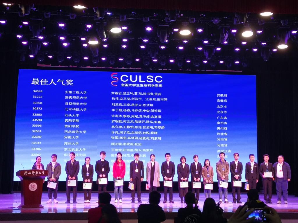 2019年11月8日至11月10日,第三届全国大学生生命科学竞赛决赛在陕西师范大学如期举行。经过赛前抽签、现场答辩、专家提问等环节的激烈角逐,我院两支代表队分别获得了1个一等奖、1个二等奖和1个最佳人气奖的好成绩。最终,经过专家组委会的裁定,我院学子在本届比赛中共获得一等奖1项、二等奖1项、三等奖3项、优胜奖6项、最佳人气奖1项的骄人成绩。