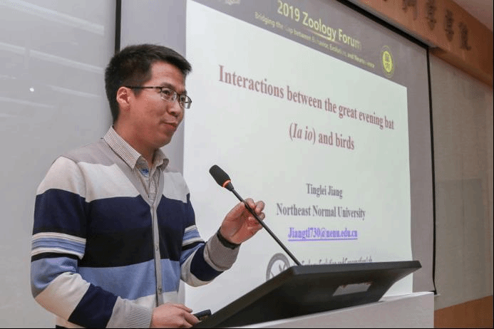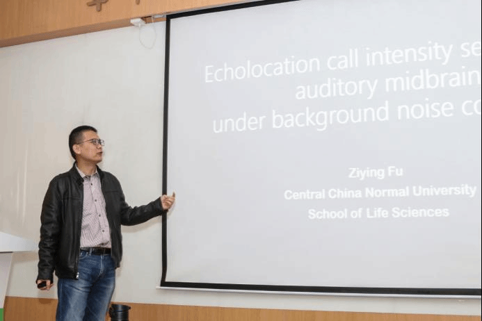 下午论坛继续进行,分别由东北师范大学江廷磊教授做题为《蝙蝠与鸟的交流》(Interactions between the great evening bat (Ia io) and birds)的报告、华中师范大学付子英副教授的《噪声环境下听觉中脑对回声定位声波强度的感知》(Echolocation call intensity sensation in auditory midbrain under background noise conditions)、华中师范大学罗金红教授做题为《蝙蝠的发声整合》(Audio-vocal integration in echolocating bats)报告。