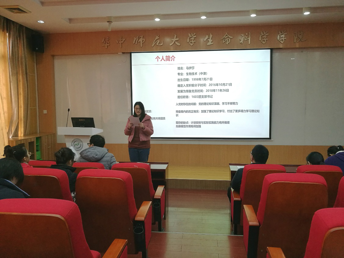 首先,由袁颖敏介绍会议流程、党员到会及党费缴纳情况。按照党员发展程序,预备党员逐一汇报在一年预备期中的个人情况,他们从思想、学习、学术科研、学生工作等方面进行了详细说明。接下来,支委会报告其审查情况,与会党员对6位预备党员的情况进行了充分的讨论,经无记名投票表决,一致同意马伊莎等6名同志按期转正。之后,马伊莎等6名同志向党组织表明了自己要坚定理想信念、刻苦学习、认真工作、为社会做贡献的态度。