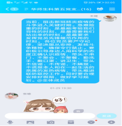 1月20日我回到家后立马就进入了二楼隔离小屋,在被隔离的16天里,修改论文之余,我也想做点什么,于是我每天在群里跟大家分享防疫的知识,和回家的同学保持联系,告知他们一定严格的做好自我隔离,主动汇报行动轨迹,督导大家按时量体温,询问大家的身体状况,关心他们的家人有无被确诊,一对一进行心理疏导,引导他们不要惊慌、不要害怕,要充满信心、保持乐观心态,相信我们能战胜疫情。同时推荐可靠的捐款渠道,引导大家为武汉防疫尽自己的微薄之力。