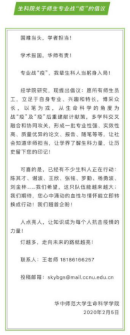 华大生科讯(通讯员 王棣)庚子新春,突如其来的新型冠状病毒肺炎疫情牵动人心。当前疫情防控工作处在关键时期,网络谣言扑面而来,增加了社会恐慌情绪,成为另外一种伤害。生命科学学院积极响应学校党委号召,向全院师生发出《生科院关于师生专业战“疫”的倡议》,学生工作团队发出《生命不息 共同战“疫”——致全院同学的倡议》,鼓励师生充分发挥专业特色与优势,贡献生命科学的智慧与力量投身参与到科普知识创作中,遏制谣言,传播健康卫生知识,助力疫情科学防控。