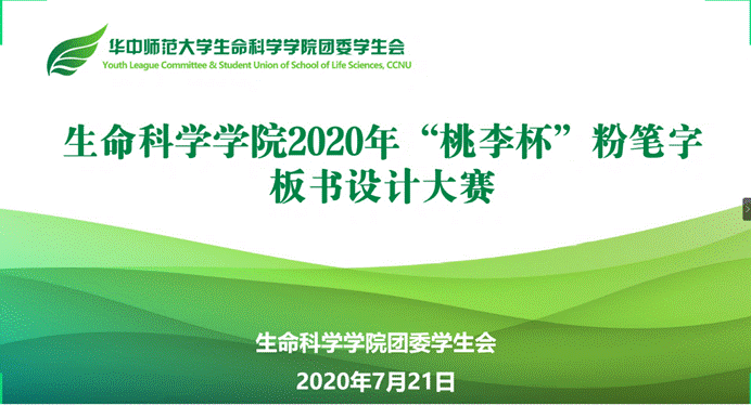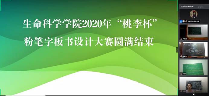 华大生科讯(通讯员 范文媛)行楷隶篆见功夫,书法艺术耀夜空。2020年7月21日晚,我院2020年“桃李杯”粉笔字板书设计大赛在腾讯会议线上举行。院学科教学专业副教授李娟、团委书记兼本科生2019级辅导员唐佳琦、团委副书记余璇、本科生2018级辅导员王玉梅、本科生2017级辅导员王棣、校第九届粉笔字板书设计大赛三等奖获得者陈钊燕、书写能力训练指导团副团长陈琼琼和叶雨涵受邀担任本次比赛的评委,院党委书记邱玉华、副院长吴华作为嘉宾出席活动。