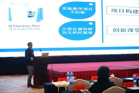 实验教学示范中心万建老师做了题为“基于高分辨质谱技术的实验教学设计与探究”的报告,以通过技术攻关-自研自制省耗材、实验教学项目构建-贴近教学辅教材、创新课堂-以赛促学树人才三个方面向与会代表分享了我院在推进科研成果转化本科实验项目的相关工作。
