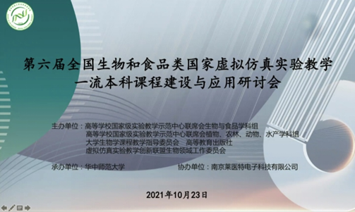 10月23日,第六届全国生物与食品类虚拟仿真实验教学一流课程建设与应用研讨会以线上腾讯会议形式召开,本次会议由高等学校国家级实验教学示范中心联席会生物与食品学科组,高等学校国家级实验教学示范中心联席会植物、农林、动物、水产学科组,大学生物学课程教学指导委员会,高等教育出版社,虚拟仿真实验教学创新联盟生物领域工作委员会主办,华中师范大学承办,南京莱医特电子科技有限公司协办,来自国内60余所高校的300多位代表参会,会议共安排了16场学术报告,为与会嘉宾带来了一场内容丰富的学术盛宴。
