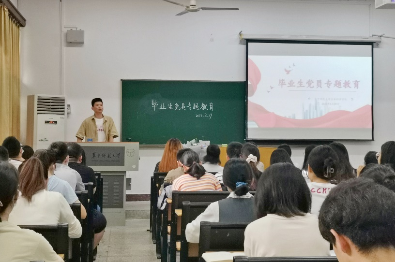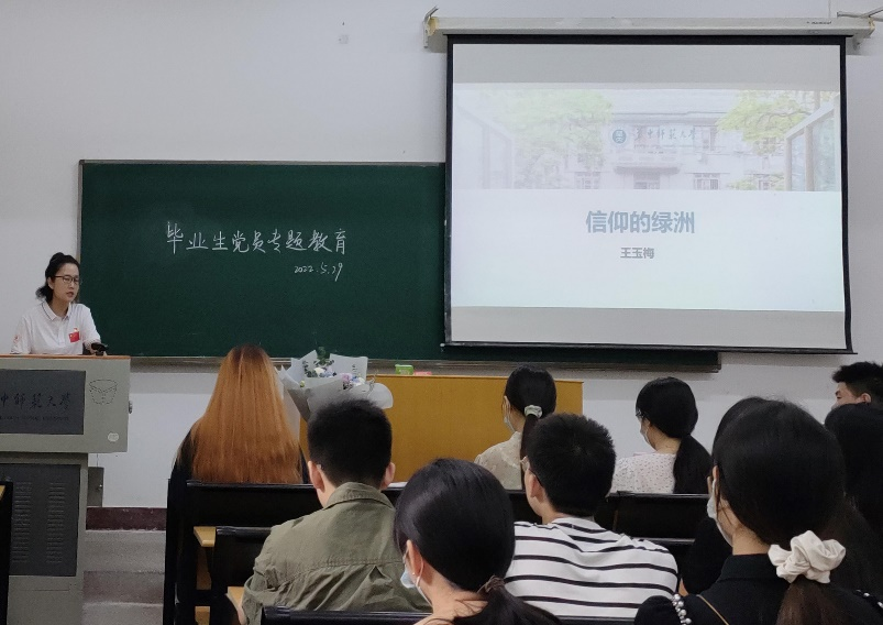 华大生科讯(通讯员:吴雨霏、宋清如)为进一步加强毕业生党员教育管理,坚定理想信念,强化党员意识,锤炼党性修养,5月29日上午,我院2022届毕业生党员专题教育于7103教室顺利开展。马克思主义学院教师王玉梅受邀为我院毕业生作题为“信仰的绿洲”的党员教育讲座。本场讲座由闫威威主持,我院本科毕业生党员以及研究生毕业生党员和2019级预备党员参加。
