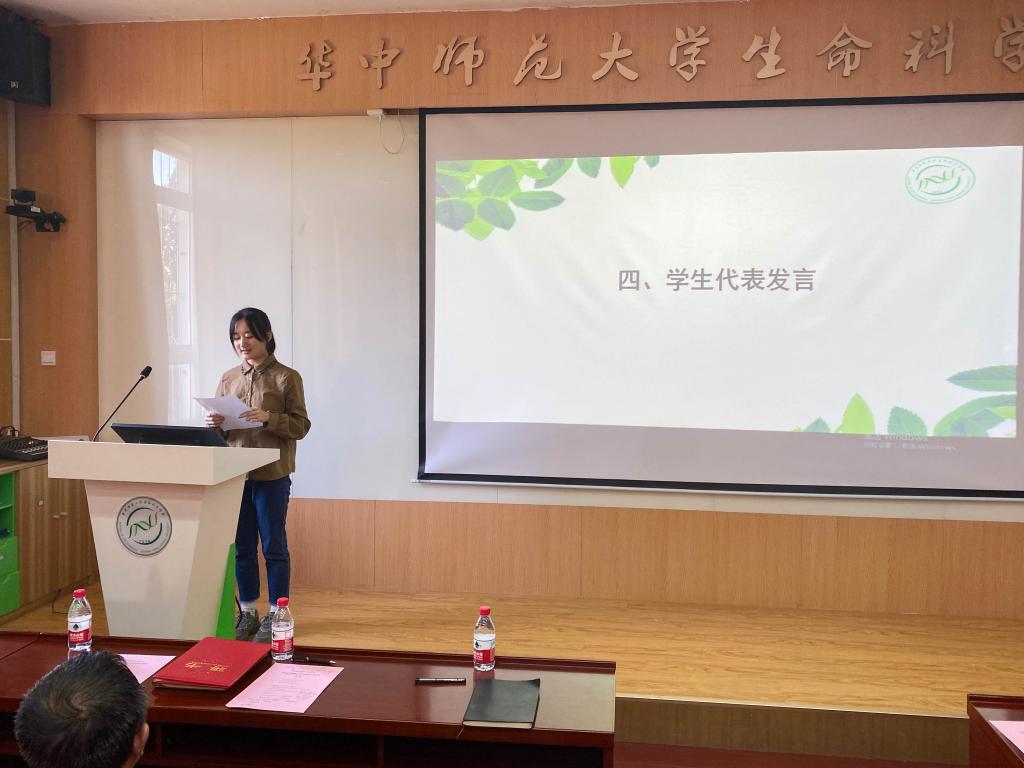 接着,生物科学拔尖2201班李晴晨同学作为学生代表发言。她表示,自己在成长路上遇到过很多好老师,而这也激发了她想要成为一名未来优秀老师的愿望,“拔尖计划不仅是一个选培养人才的项目,更是能让我们深入了解生物这门学科的广阔平台。”随后,2201班班主任、生物技术拔尖班导师万翠红作为导师代表讲话。她先为同学们讲解了“科研是什么”——科研是为了探寻事物本质与规律而进行的活动,它不一定非要是大科学家才能做的事情。她希望大家积极参与科研,再慢慢地爱上科研,并向周围的人传播生命科学的美。