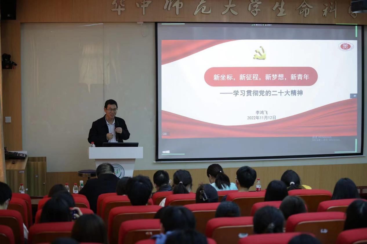华大生科讯(通讯员:刘琴、覃川哲、曾思蕾;摄影:周权)11月12日上午十点,副校长李鸿飞在生命科学学院5301报告厅面向基层学院青年学生开展党的二十大精神巡讲,主题为《新坐标,新征程,新梦想,新青年——学习贯彻党的二十大精神》。生命科学学院、城市与环境学院、音乐学院、公共管理学院第十期党员发展对象培训班全体学员和四个学院的党委书记、副书记到场参加学习。