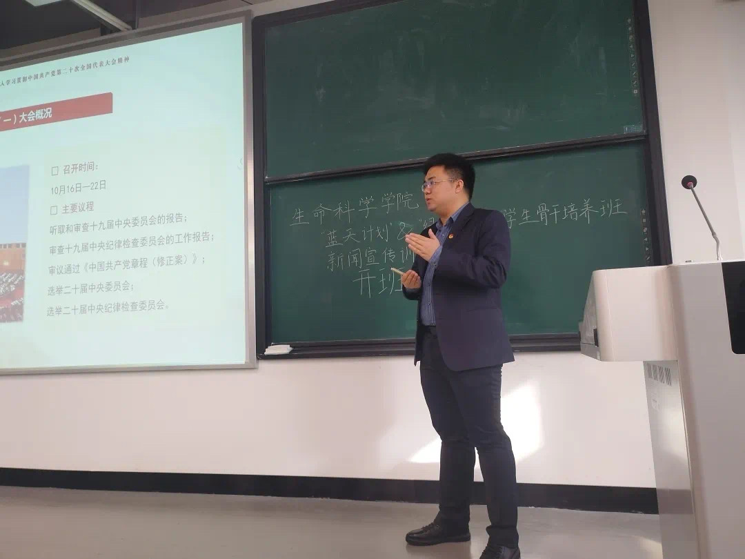 开班仪式结束后,由校团委副书记(学生)陈凌继霄为学员们讲授第一讲课程。他以“夺取新时代中国特色社会主义新胜利的政治宣言和行动纲领——深入学习贯彻中国共产党第二十次全国代表大会精神”为主题,从大会召开时间、主要议程、大会主题等方面为学员介绍了二十大的概况以及二十大报告的主要内容。
