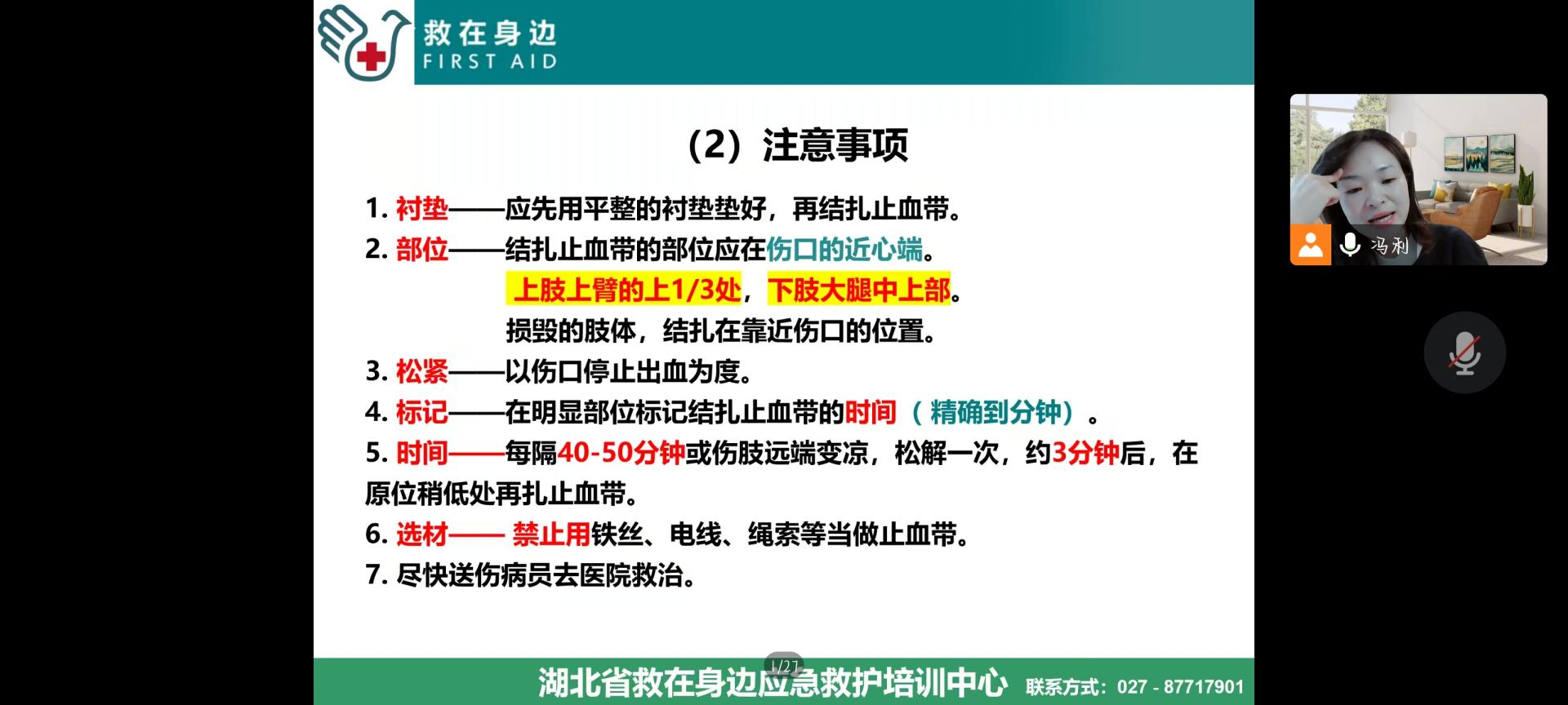 线上培训由冯利老师担任理论主讲教师,为同学们讲解红十字运动基本知识、救护概论、心肺复苏、AED、气道异物梗阻、创伤救护等理论知识,便于同学们更好地掌握急救技巧与要点,为之后的实操练习打下坚实的理论基础。