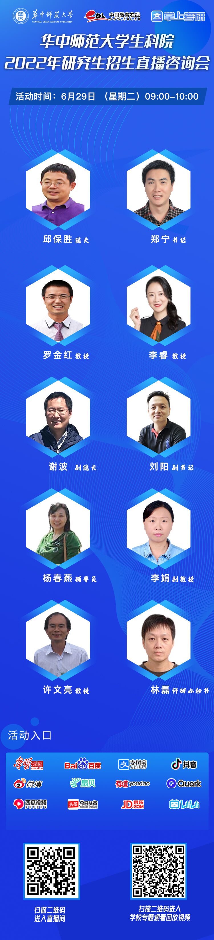 为满足考生对研招咨询的需求,建立高校与考生间的多方位信息沟通平台,中国教育在线·掌上考研联合华中师范大学举办的华中师范大学生科院2022年研究生招生直播咨询会即将召开!