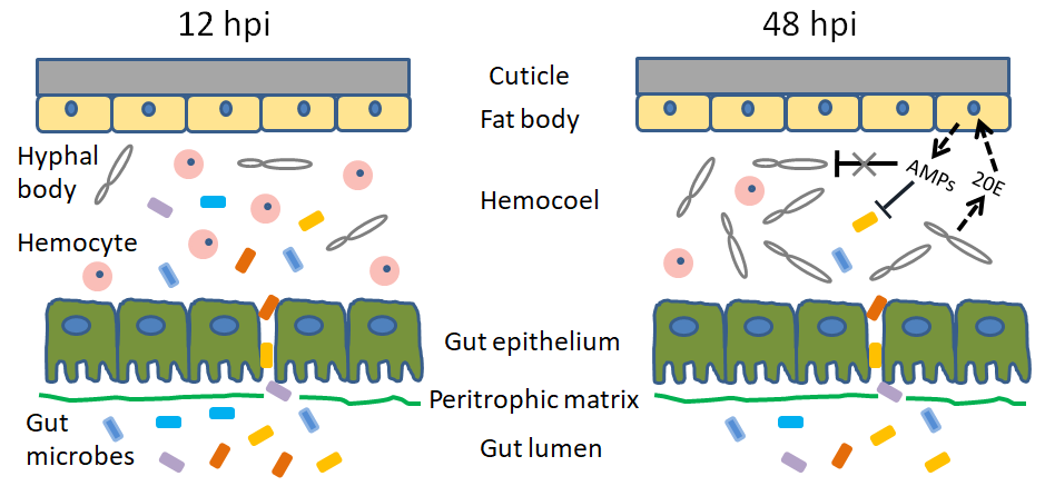 本研究发现,莱氏绿僵菌(一种昆虫病原真菌)感染棉铃虫后显著增强了抗菌肽的表达和血浆的抗菌活性。同时,莱氏绿僵菌的感染使棉铃虫中肠受到破坏,导致肠道菌进入血腔,这些入侵到血腔的肠道菌在血浆抗菌活性作用下被迅速清除。此外,这些上调表达的抗菌肽是由真菌感染导致,而非入侵到血腔的肠道菌诱导。棉铃虫血淋巴中的蜕皮激素滴度在真菌感染48小时后显著升高,且诱导了抗菌肽基因的表达。这些抗菌肽(如cecropin 3和lebocin)能够抑制入侵到血腔的肠道菌,但却对真菌无抑制活性。进一步研究发现,入侵到血腔的肠道菌与真菌竞争血淋巴中的营养物质。