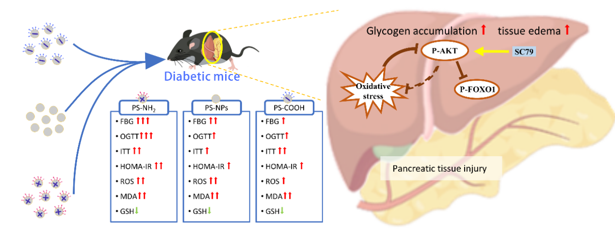 2024年4月24日《Particle and Fibre Toxicology》在线发表了题为“Polystyrene nanoplastics with different functional groups and charges have different impacts on type 2 diabetes”(https://rdcu.be/dFGoG)的研究论文。该研究调查了不同官能团(电荷)的纳米塑料暴露对血糖水平的影响。研究发现,三种不同功能基团修饰的PS-NPs均会导致二型糖尿病(T2DM)小鼠模型的空腹血糖(FBG)水平显著升高;导致葡萄糖耐受不良和胰岛素抵抗的增加。也会诱发糖原累积、肝细胞水肿以及胰腺损伤。比较不同功能团或电荷对T2DM的影响,氨基修饰的纳米塑料的FBG升高、糖原累积和胰岛素抵抗最为显著。调查其机制发现,纳米塑料暴露抑制了AKT和FoxO1的磷酸化。而使用AKT激活剂SC79处理可有效挽救这一过程,并减轻类似T2DM的病变。