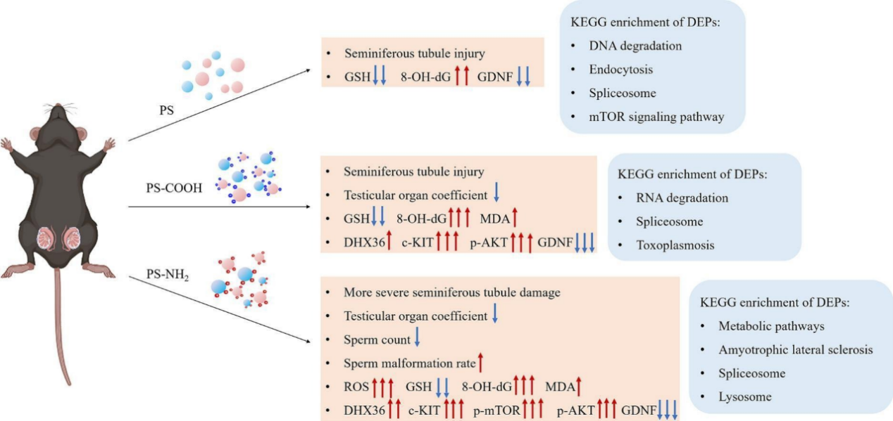 2024年4月20日《Science of The Total Environment》正式发表了题为“Comparing the effects and mechanisms of exposure to polystyrene nanoplastics with different functional groups on the male reproductive system” (https://doi.org/10.1016/j.scitotenv.2024.171299)研究论文。该研究分别利用原始的PS-NPs、羧基修饰的PS-NPs和氨基修饰的PS-NPs对小鼠进行暴露,研究结果表明具有官能团修饰的PS-NPs比未修饰的聚苯乙烯更具毒性,而具有带正电氨基修饰的PS-NPs毒性最强。三种PS-NPs均会引发氧化应激和DNA损伤,降低睾丸指数,破坏曲细精管外壁,减少精原细胞数量和精子数量,增加精子畸形率。蛋白质组学分析显示差异表达蛋白主要富集于蛋白质转运、RNA剪接和mTOR信号转导。进一步证实PI3K-AKT-mTOR信号通路被过度激活,这可能导致精原细胞干细胞因过度分化而减少。该研究为有效评估环境相关纳米塑料的毒理学效应及体内暴露诱导的雄性生殖毒性的机制提供了新的认识。