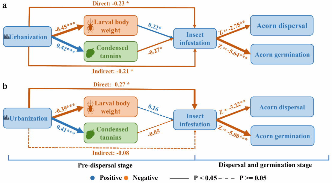 种子扩散前阶段城市化对昆虫蛀食者体重、橡实单宁含量和昆虫捕食率的影响路径以及昆虫捕食在种子扩散后阶段对种子命运的影响。