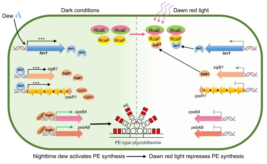 具体来说,名为“发菜”的荒漠蓝藻在夜间吸水后会启动一种“色适应”机制,诱导藻红蛋白的合成,从而优化在弱光下的光能捕获能力。研究团队通过遗传分析发现,一个名为 SigB1的关键调控因子在此过程中不可或缺,它与激活因子CpeR1协同工作,共同调节捕光机构的合成,提升对微弱晨光的利用效率。有意思的是,过去科学界通常认为蓝藻的这类色适应主要由光质调控。但本研究显示,在黎明到来之前,荒漠蓝藻吸水后相关基因就已经被大量诱导表达,说明夜间水分信号在此过程中扮演了关键角色。进一步机制剖析发现,一个上游的转录因子Hrr1会在细胞夜间吸水后被诱导表达,进而打开SigB1/CpeR1通路,启动藻红蛋白的合成。